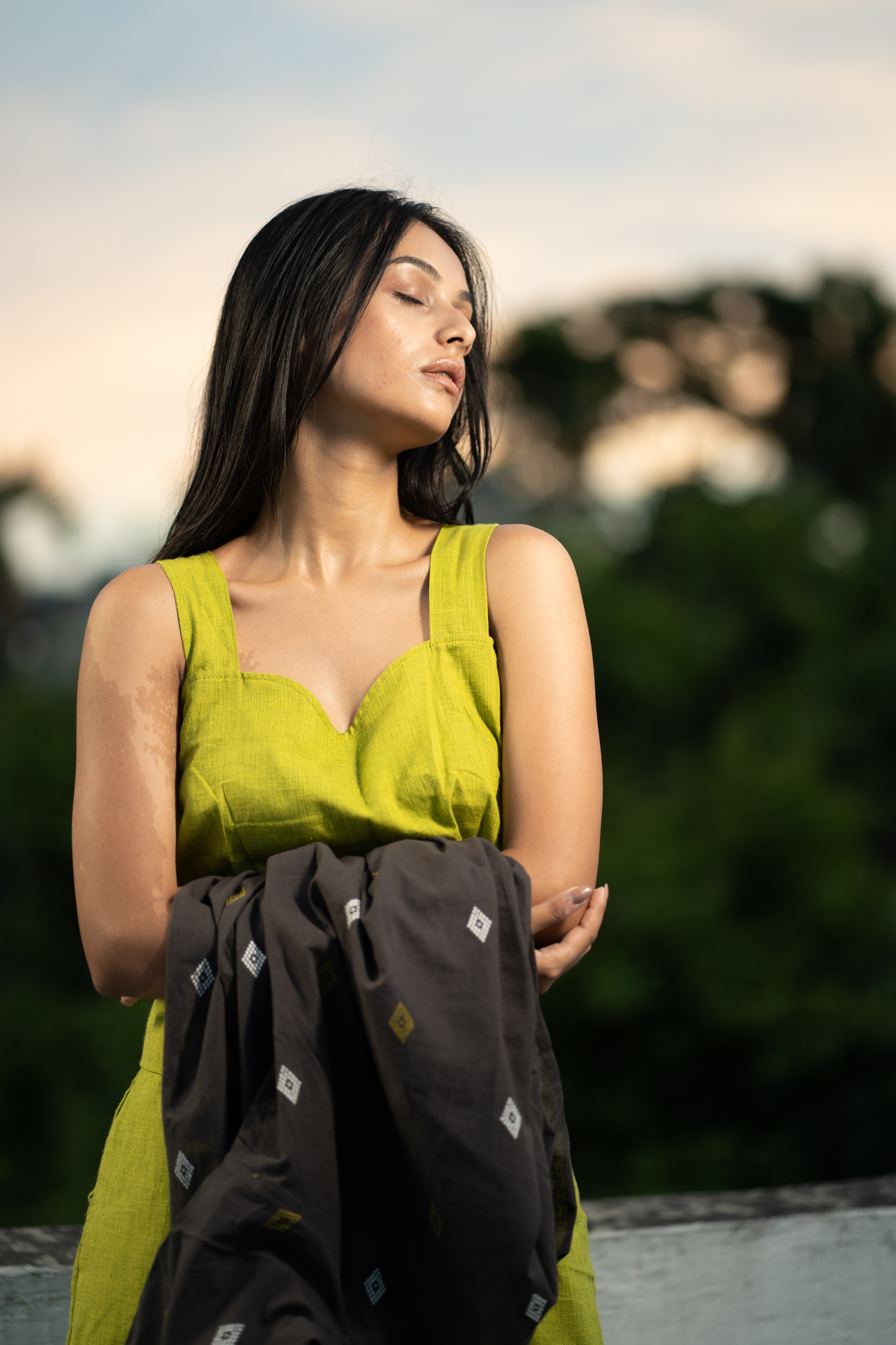 The dark grey full-sleeve shrug combines with the green pure cotton bralette cut top and ankle-length cigarette pants create an oomph factor and is a must-have addition to your closet. Give yourself the look and confidence you deserve and get this charming attire for a perfect date night.