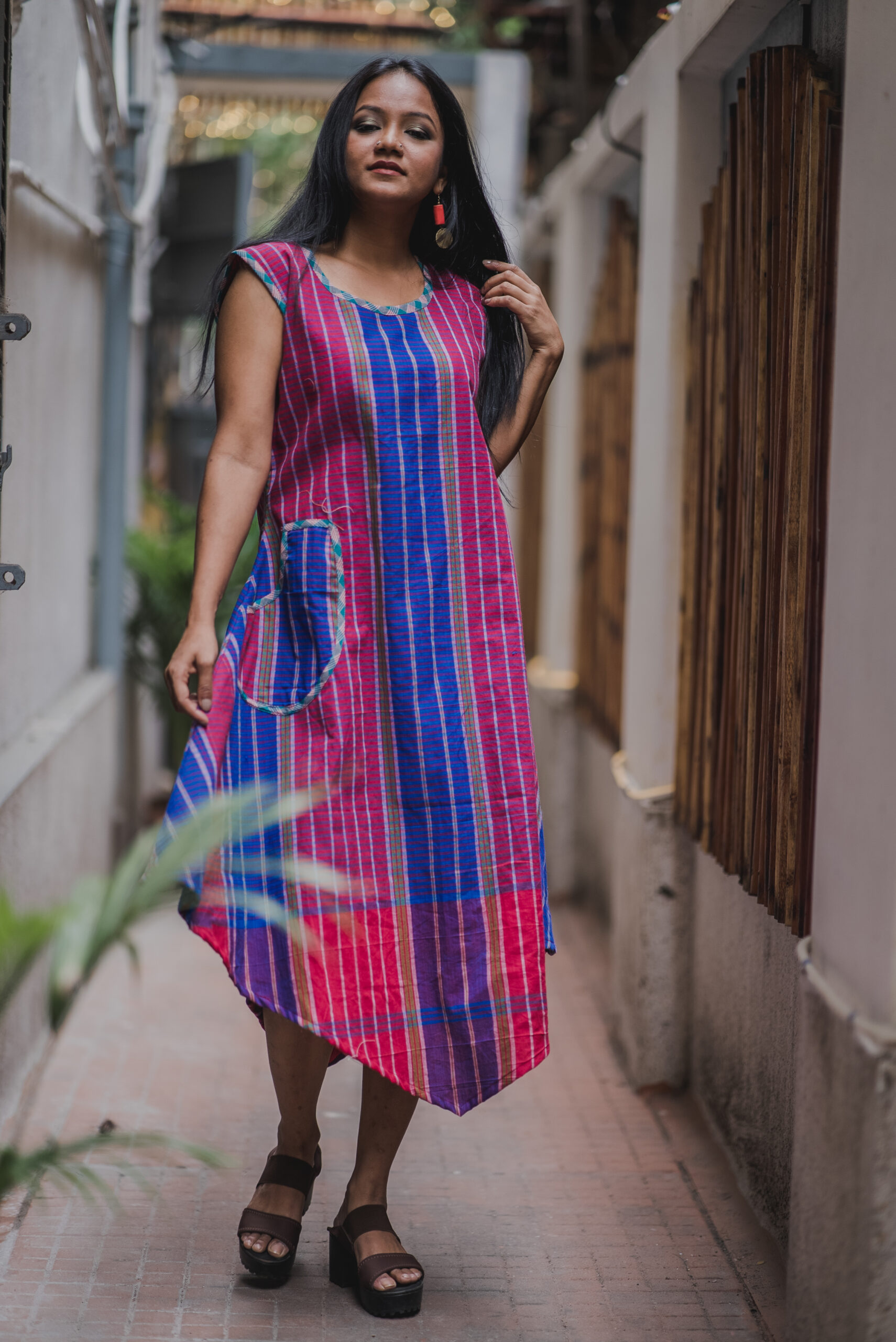 This vibrant Gamchha dress with striking blue, pink and purple hues, featuring a classic round neck and a playful side pocket ensure you stand out in style.