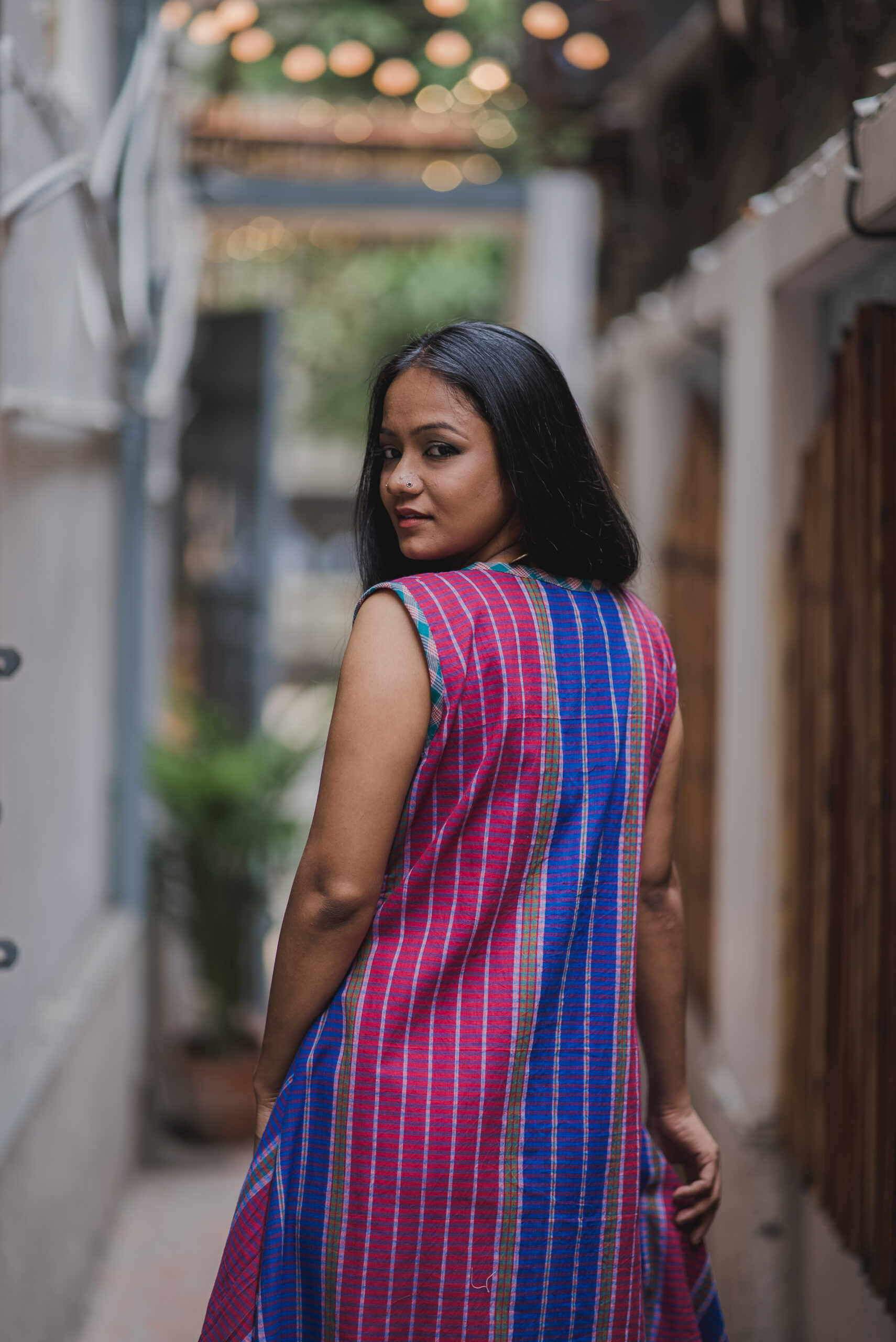 Red & Blue Gamchha Asymmetric Sleeveless Dress
