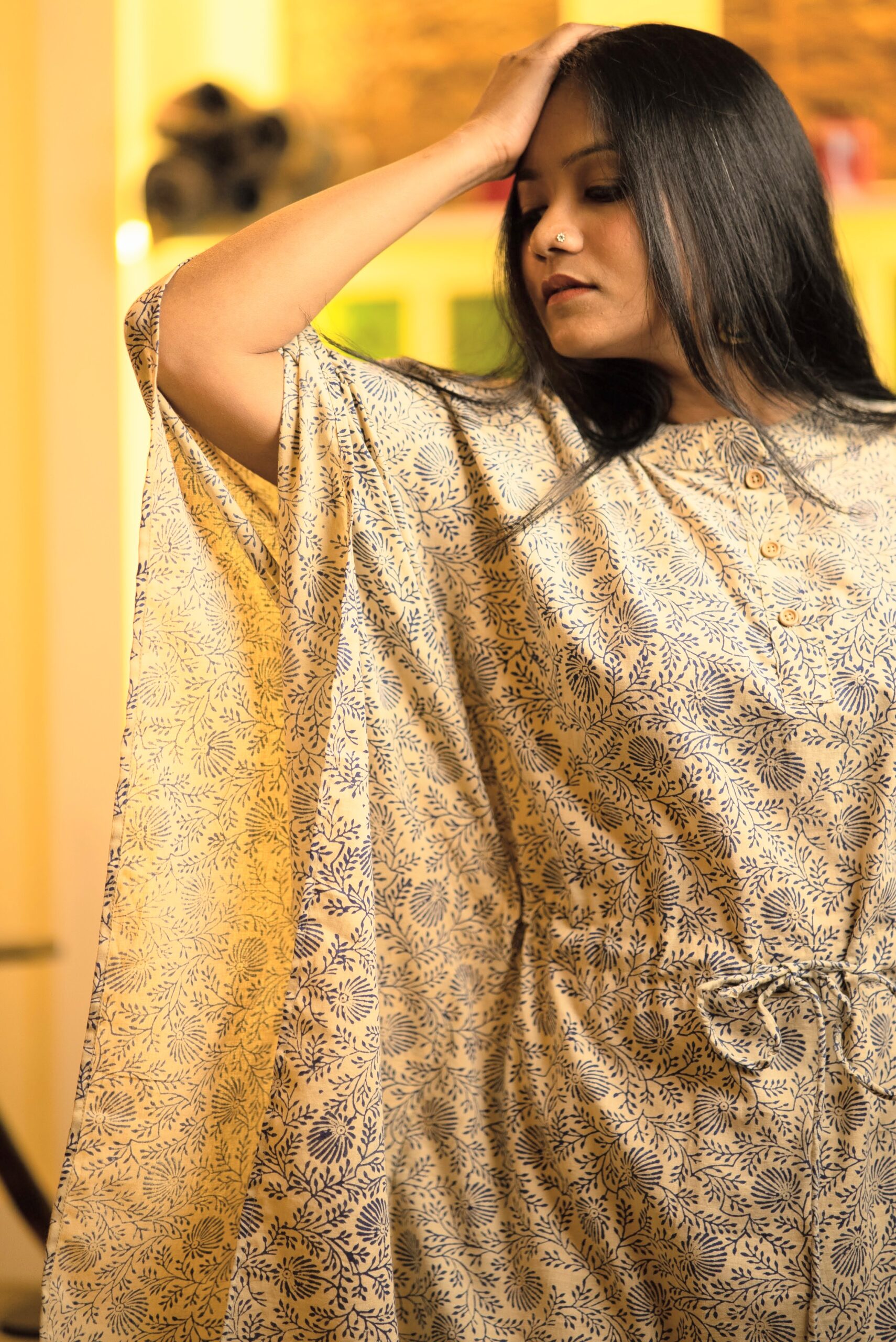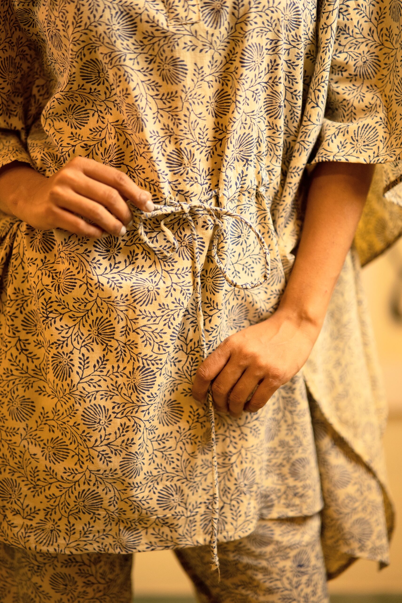 Short Kaftan with Chinese Collar and Capri Cigarette Pants, featuring a chic navy blue print, adjustable waiststring, and side pockets—perfect for a stylish evening out!